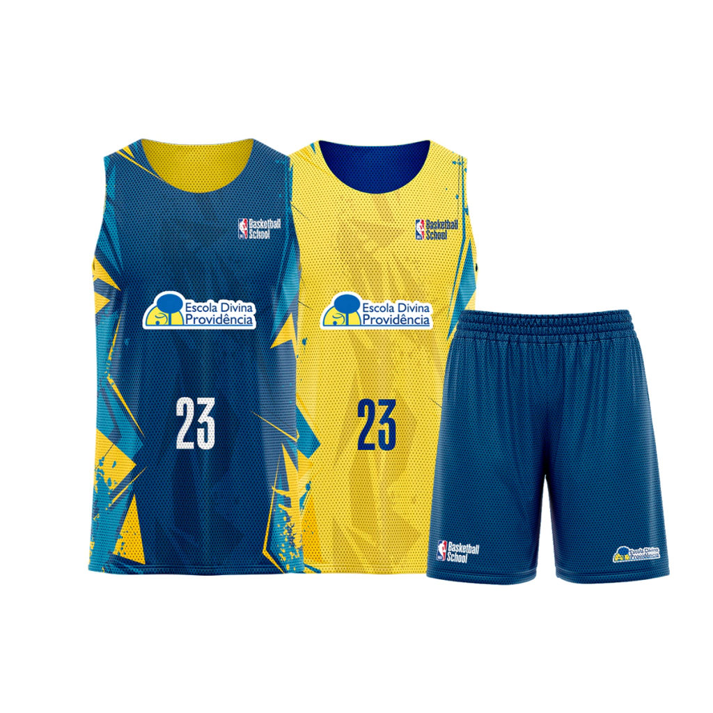 Desenvolvido para o seu treino no NBA Basketball School, o uniforme de jogo é composto por uma regata dupla face e uma bermuda simples.