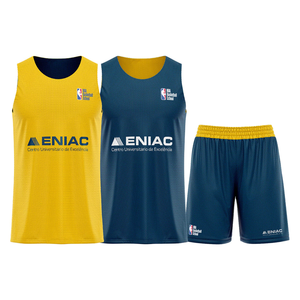 Desenvolvido para o seu treino no NBA Basketball School, o uniforme do aluno é composto por uma regata dupla-face e uma bermuda face simples.